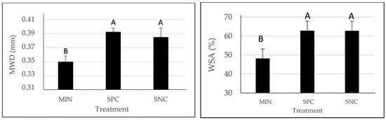 Mean weight diameter (MWD) and water stable aggregates (WSA) for the different treatments: MIN (mineral fertilization), SPC (soil P criterion using sludges), and SNC (sludge N criterion). Average columns with different letters are significantly different according to the Duncan multiple range test for the α = 0.05 probability level. Vertical lines show the standard deviation.