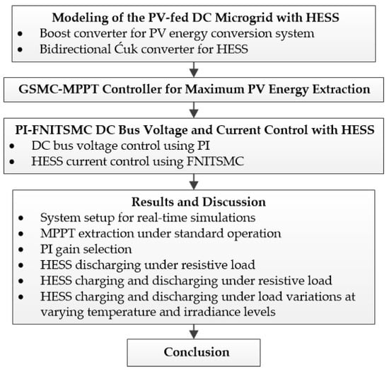 The remaining sections of this article are organized as illustrated in Figure 1. Section 2 presents the modeling of the PV system and HESS. Section 3 gives the design of the MPPT controller based on the global sliding mode control (GSMC). Section 4 gives the complete design of the proposed voltage and current control with the HESS. Section 5 explains the system configuration used in simulations. Stability analysis is carried out for load and input duty cycle variations. Rigorous HIL simulations are then performed, and results are discussed and analyzed. Conclusions are then drawn in Section 6.