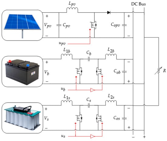 The BESS shown in Figure 2 consists of a bidirectional Ćuk converter. The controller regulates the battery’s charge and discharges to stabilize the power balance. The current, , in the capacitor, , can be negative, positive, or null. When is greater than 0, it indicates a discharge mode; when it is less than 0, it indicates a charge mode; and when it is null, it indicates a standby mode. The configuration of the SESS is also identical to that of the BESS, with as the output capacitor. The other components in both subsystems are shown in Figure 2. As both the BESS and SESS are identical, all the parameters are given a subscript, , where for the BESS and for the SESS.