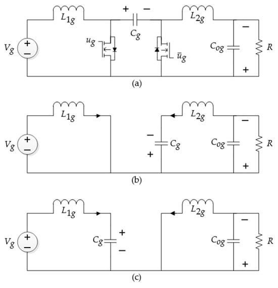 (a) Bidirectional DC–DC Ćuk converter; (b) switch on; (c) switch off.