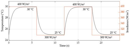 where is the number of PV cells connected in series in a panel; is the Boltzmann’s constant; is the P-N junction characteristic factor; is the temperature of the cell; is the reverse saturation current; C is the electron charge; and is the photocurrent. is related to cell temperature and solar radiation as follows: