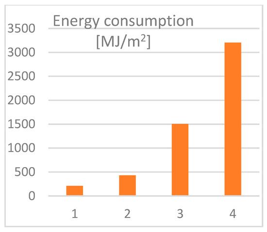 Energy consumption for obtaining 1 m2 panel (MJ/m2) (1) of geocomposite with waste inserts; (2) from autoclaved concrete; (3) from cellular concrete; and (4) with a double brick structure (with data from [5,8,9]).