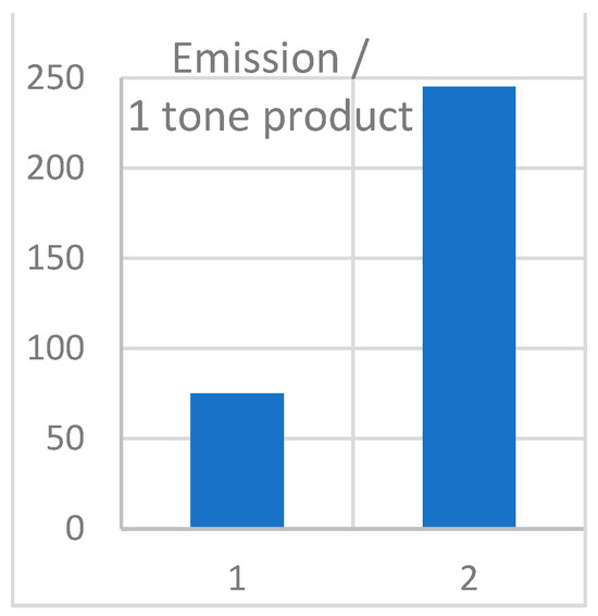 Emission of greenhouse gases for obtaining 1000 kg of product: (1) geocomposite panel with waste inserts; (2) panel based on Portland concrete (with data from [5,8,9]).