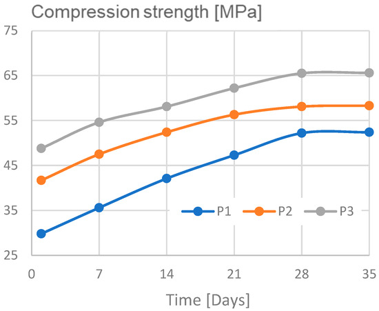The compression strength values of the geopolymer mixtures show an increasing trend after 1–28 days from the time of their preparation. After 28 days, the values remain practically constant. Depending on the preparation conditions and their composition, the respective values varied between 30 and 70 Mpa after 28 days. In general, the strength depends on the initial concentration of NaOH, being superior for a higher content after 28 days (Figure 4). The highest resistance value was achieved for the geopolymer with the highest content of ash (P4), which can be explained by the higher ratio of SiO2/Al2O3 (Figure 5).