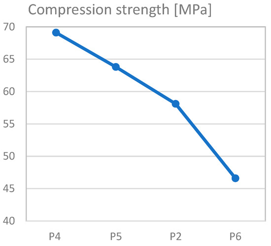 The compression strength test was performed according to [48,58]. The compression strength of the material was determined on specimens in the form of prisms with dimensions of 40 mm × 40 mm × 160 mm, and the results are presented in Table 7.