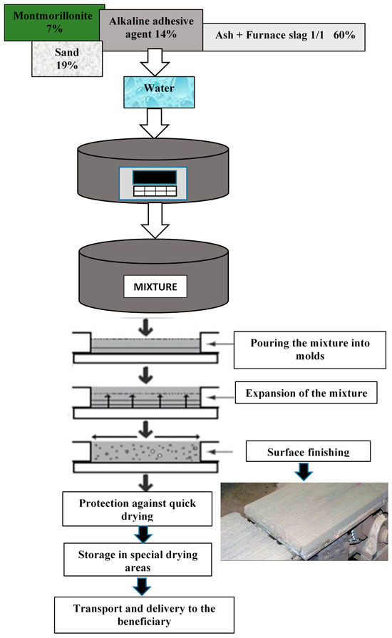 Following the results of the characterization tests described above, which demonstrated that composites formed of ash and slag in a 1:1 ratio offer superior performance at higher concentrations of alkaline adhesive agent, the composition for manufacturing structural insulation panels was chosen to be: 60% power plant ash and furnace slag (mass report 1:1), 14% alkaline adhesive agent NaOH—12 M solution, 7% montmorillonite anhydrous absorbent ((Na,Ca)0.33(Al,Mg)2(Si4O10)(OH)2), and the remainder, sand, with water to ensure workability. The power plant ash and furnace slag were as described in Table 1. The montmorillonite for building industry use was purchased from Mapei Industry (Romania) and its properties were: free expansion [54]: >27 mL/2 g; fluid loss [55]: <18 mL; water absorption [56]: >750%; viscosity in a Marsh 1500/1000 tunnel: 38–40; and filtered water pH: 9. The sand for construction of river origin, with grit under 2 mm, was supplied by the Adeplast Company (Romania).