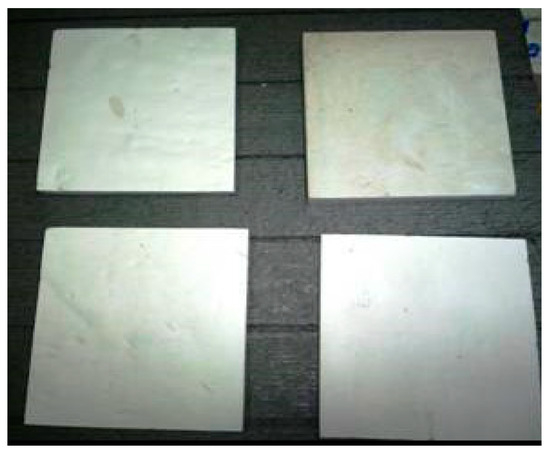 The tested specimens were in the form of a flat plate with parallel faces and dimensions of 300 mm × 300 mm × 20 mm, according to the procedure in [59].