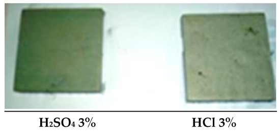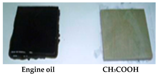 The chemical resistance tests were made upon plate-shaped samples with flat faces and straight edges and dimensions of 100 mm × 100 mm × 10 mm. The conditioning of the samples to be tested was carried out in the laboratory atmosphere, for 24 h, at a temperature of +230 °C ± 20 °C and a relative air humidity of 50% ± 5%. The samples (Figure 7) were immersed in liquid chemical solutions, namely, H2SO4—3%, HCl—5% (Figure 8), CH3COOH—3%, and synthetic engine oil (Figure 9), being kept in a state of total immersion for 48 h.