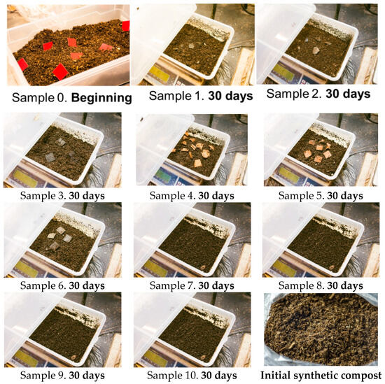 Three reactors were set up for testing each material. The ratio between the mass of the material under examination and the mass of the wet synthetic compost was within the range of 0.5–2%.