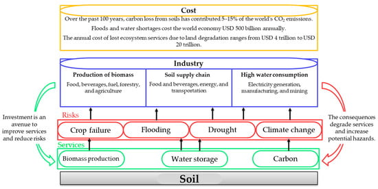 Soil is crucial for the production of food, fiber, fuels, climate control, and water supply [1]. However, many businesses are unaware of the relationship between soil health and economic performance. Soil degradation can lead to pollution, mainly from agricultural and industrial activities. Compared to water or air, the soil tends to be a more prolonged habitation for pollutants [2,3,4]. Soil acts as a sink or filter, allowing contaminants to be absorbed quickly but disintegrate slowly [3,4,5,6]. Soil degradation has a negative impact on regional and global economies, climate change, and economic expansion by reducing soil water storage capacity and releasing inappropriate carbon [7,8,9,10,11,12,13,14], as shown in Figure 1. Contaminated land hinders economic expansion, reduces real estate prices, and reduces the attractiveness of municipalities owing to the release of harmful substances into the soil, air, and water [15,16,17].
