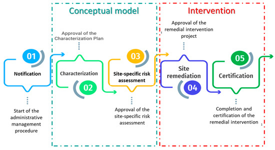 The management procedure can be divided into three main stages: notification, conceptual modelling, and intervention. The notification includes the initial steps of the administrative procedure, the conceptual model focuses on site characterization and risk assessment, and the intervention covers the actual remediation process and certification.