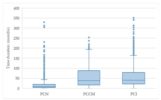 Time duration for completed procedures in the province of Brescia according to closure modality: after notification without any further action (PCN), after conceptual model without any further intervention (PCCM), and after intervention (PCI).
