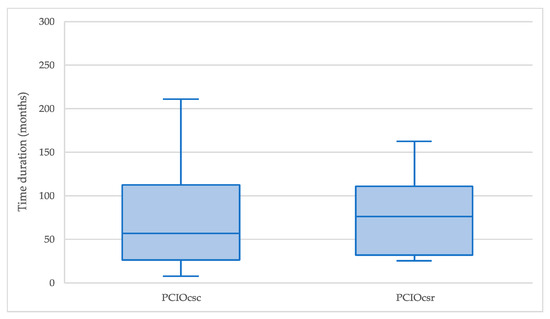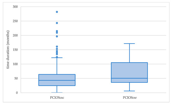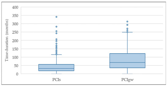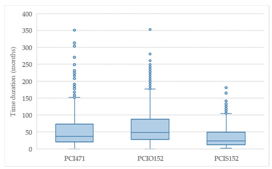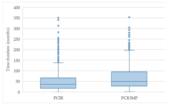 The PCIR and PCIOMP medians (respectively 36.3 and 49.3 months; Figure 4) are statistically different (p-value less than 0.05) at the 95% confidence level; the difference is even more significant when comparing the 75th percentile (66.0 and 95.5 months). The PCIR duration distribution (percentiles) is systematically lower than PCIOMP. According to the Kolmogorov–Smirnov test, it was identified that the maximum distance is 0.18 with the p-value less than 0.05, and the two distributions are significantly different between them at a 95% confidence level.