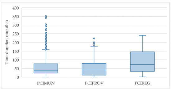 From the PCI population, time duration data were divided into three groups based on the competent authority for the administrative management (Table 2): (i) municipalities (PCIMUN, 2597 sites); (ii) provinces (PCIPROV, 284 sites); and (iii) regions (PCIREG, 61 sites). The PCIMUN and PCIPROV timing data are described by non-parametric distributions, while PCIREG data are found to be lognormal. In order to compare the three groups, we performed non-parametric statistical tests (Figure 6).