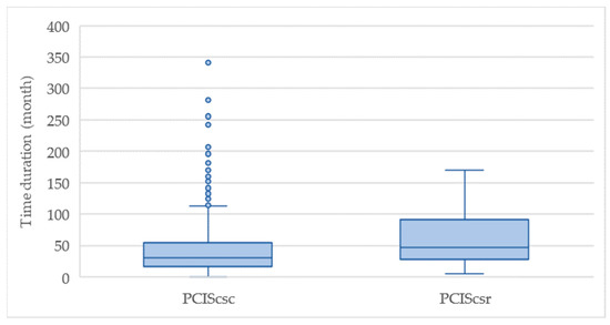 A non-parametric distribution characterizes the timing data for PCISCSC, while the data for PCISCSR follow gamma and lognormal distributions. Non-parametric statistical tests were conducted to compare these two groups. The distributions were found to be significantly different (p-value less than 0.05 at a 95% confidence level). Despite the limitations of the available data, the timing distribution for PCISCSC is significantly lower than that of PCISCSR. The median duration for PCISCSC is 30.3 months, whereas the median duration for PCISCSR is 47.4 months (Figure 8).