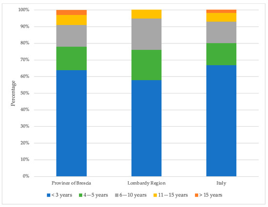 When the graphs in Figure 9 are compared, it is clear that in each case, almost 60% of the procedures were finished within three years. While around 14% of the processes took 4–5 years or 6–10 years, about 7% required 11–15 years. And finally, a little more than 3% needed more than 15 years. Figure 9 includes all procedures, even those that did not need remediation activities; therefore, there was a significant overrepresentation of procedures concluded within less than three years. Therefore, this study was constrained to the following categories in order to obtain a more insightful analysis based on the Brescia provincial data (Figure 10):