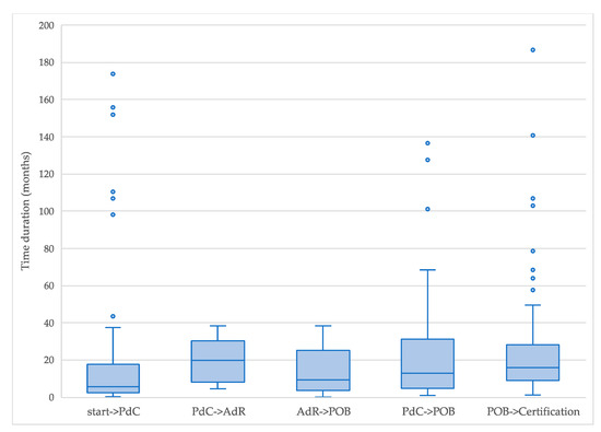 The next part of this study focused on the province of Brescia in the Lombardy region of Italy. The province of Brescia has a history of industrial pollution stemming from some chemical industries that have operated since 1906 and were known for producing caustic soda and, later, PCBs (polychlorinated biphenyls) [51]. Subsequent environmental agency investigations verified the severe contamination, which designated those areas as polluted sites of national interest. Therefore, contaminated sites and remediation data of Brescia were analyzed in collaboration with the province of Brescia, the study of which consisted of 168 municipalities in question for a total of 609 procedures. The methodology of the present study for analyzing the times for remedial procedures was organized in several stages.