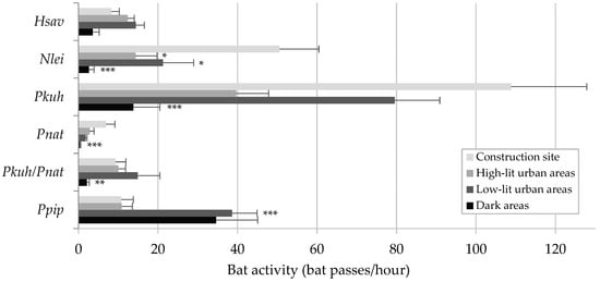 - Straka, T.M.; Wolf, M.; Gras, P.; Buchholz, S.; Voigt, C.C. Tree Cover Mediates the Effect of Artificial Light on Urban Bats. Front. Ecol. Evol. 2019, 7, 91. [Google Scholar] [CrossRef]