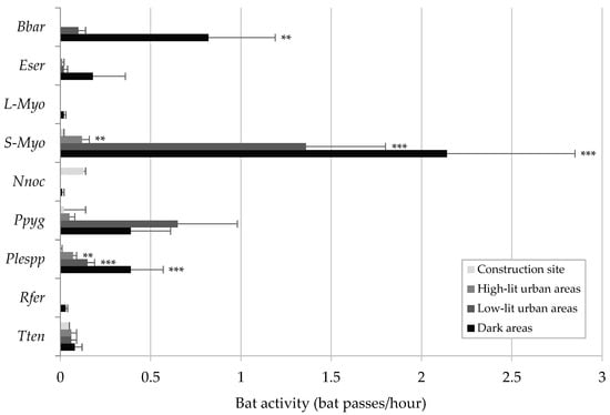 - Mathews, F.; Roche, N.; Aughney, T.; Jones, N.; Day, J.; Baker, J.A.; Langton, S. Barriers and benefits: Implications of artificial night-lighting for the distribution of common bats in Britain and Ireland. Philos. Trans. R. Soc. B Biol. Sci. 2015, 370, 20140124. [Google Scholar] [CrossRef]