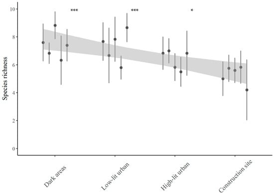 - Dark areas: These sites were in unlit natural areas near the construction site, where artificial lighting is nearly absent. Specifically, two sites were in forest environments, two in ecotonal environments, and one in an open environment. The maximum light intensity was 0.48 ± 0.86 lux.