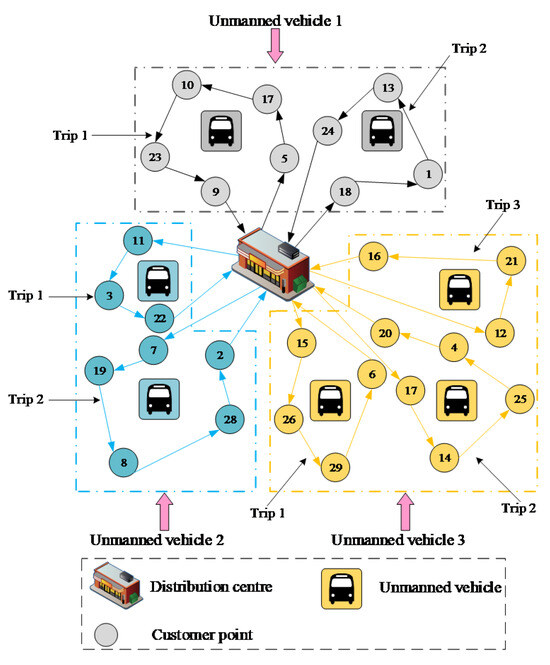 The unmanned vehicle delivery routing problem is fundamentally a VRP, which has found a growing range of applications that require its solving in daily life, such as material distributions [9], drone path optimization [10,11], home healthcare system applications [12], public transit services’ mode and route optimization [13], electric vehicle path problems considering battery charging status [14,15,16], dynamic VRPs [17,18], emergency material dispatch optimization [19,20,21], service-oriented collaborative VRPs [22], and green delivery path problems [23,24]. In contrast to the traditional vehicle routing problem (VRP), the incorporation of unmanned vehicles facilitates continuous 24 h back-and-forth deliveries without the requirement of human drivers. Consequently, this challenge has evolved into a distinct variant known as the vehicle routing problem with multiple trips (MT-VRP), introduced by Fleischmann in 1990 [25]. In this scenario, vehicles repeatedly travel between a distribution center and customer locations, necessitating the organization of trips within a restricted working period. This implies that each vehicle can undertake multiple trips, and these routes must be scheduled based on a specific timetable. When faced with limitations to fleet size, employing multiple trips becomes essential for effectively managing vehicle utilization. This approach offers the advantage of potentially reducing the number of required drivers and vehicles, leading to an overall improvement in efficiency and cost-effectiveness. Owing to its broad applicability, scholars have consistently directed their attention to this problem since its inception. In practical terms, logistics companies often find it challenging to deploy enough vehicles to meet all customer demands. As a result, they tend to maximize their utilization of a limited fleet by organizing vehicles over multiple trips.
