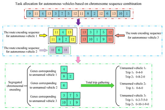 In the MT-CVRP, the coding rules are as follows: assuming that the total number of customer points to be served is , the total number of transportation vehicles is , and that each vehicle has, at most, trips for delivery, this paper plans to use these integers for chromosome coding, while the coding length of the whole chromosome is . First of all, we generate the matrix , the customer’s integer and matrix are integrated into a row vector, and then we randomly generate the length of the chromosome sequence, representing a chromosome. At the same time, expressed as a solution to the problem, the entire chromosome encoding sequence corresponds to the actual problem; assuming that all vehicles in the matrix virtualize one distribution center for each distribution trip they make, all trips should virtualize distribution centers. The corresponding decoding rules are as follows: firstly, based on the coding rules, the alleles are randomly arranged to locate the position of gene sequences within the integer range; secondly, the current coding of alleles is used to divide the trips into a number of gene segments, which in turn determine the sequences of all the customers distributed to by each vehicle.