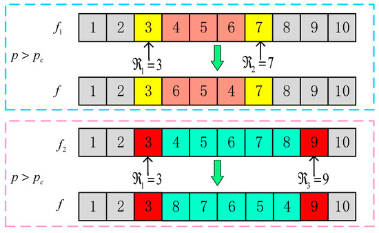 After completing population selection, individuals in the population need to undergo a crossover operation. The crossover operation used in this paper differs from traditional genetic algorithms in that it is based on a combination of generating random numbers and crossover probabilities. It selectively completes chromosome crossover and then performs gene inversion. The idea behind this crossover operation is to make the best use of the information obtained from the population to guide individuals towards the optimal direction of evolution, making the genetic operator more efficient, as shown in Figure 3. The specific steps are as follows: