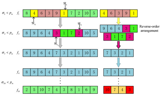- Assuming that the length of chromosome is , firstly, for the 1st gene , generate a random number , if , generate a random number of , , , mapped to gene , which forms the sequence of genes between alleles of the chromosome, in accordance with their subscripts, from smallest to largest, in order, and, after the reverse order of the sequence is embedded in (including , ), at this time observe the chromosome ; if , then do not generate a random number, and do not do anything with the gene;