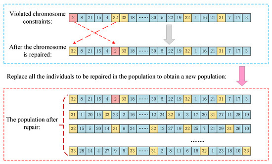 There is a problem in the above encoding and decoding process. Each trip involves the issue of the virtual distribution center. The starting point of each unmanned vehicle must be the virtual distribution center , so the first gene position of the chromosome individual must be the gene representing . However, in the evolutionary algorithm, both the individual initialization and the gene sequence disorder caused by the evolution may not satisfy the condition of gene being in the first position. Therefore, before decoding the population’s individuals, a repair operation is required. The specific approach is that if the first gene of the individual is the customer point gene instead of the distribution center gene , then the first distribution center gene found, from left to right, is swapped with the first gene. As shown in Figure 5, if , , thus the first gene of the chromosome violates the constraint by being the customer point gene , representing the number 2. After checking the chromosome, it is found that the virtual distribution center gene is 32. Therefore, the two genes are swapped to obtain a repaired individual. After repairing all individuals, a new population is obtained.