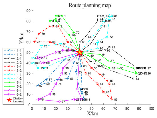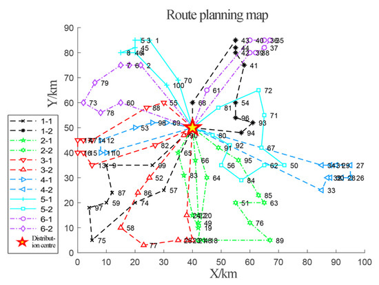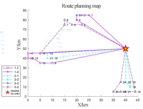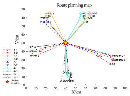 Using the large-scale data and parameters of the example in Section 4.4, a simulation of route optimization for customers was conducted without considering the impact of carbon emissions. The simulation ran independently five times to obtain average values, and the results are presented in Table 11. The route planning results are depicted in Figure 16. In the scenario where unmanned vehicles do not use fuel, there are no carbon dioxide emissions or fuel costs. A comparison of the data showed that when carbon emissions are not considered, the total cost is lower than when considering carbon emissions, with a deviation rate of 22.6%. Furthermore, a comparison of the delivery route maps in Figure 11 and Figure 14 reveals that the delivery route map considering carbon emissions has a more clearly organized overall task arrangement, with fewer intersections of the routes of unmanned vehicles, resulting in a more optimized delivery route. In real traffic scenarios, especially during significant traffic congestion, utilizing a low-carbon-emission delivery scheme can effectively optimize carbon emissions. This is because vehicle fuel consumption and carbon emissions are directly proportional and, consequently, reducing carbon emissions also reduces delivery costs. Therefore, selecting a low-carbon-emission delivery scheme not only aligns with businesses’ decision-making needs but also contributes to achieving two carbon goals.