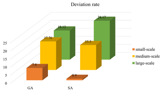 - Analyzing the total cost deviation rate in Figure 13, it can be seen that, compared to the GA, the IGA yields lower deviation rates of 7.6%, 17.76%, and 18.12% for small, medium, and large problem sizes, respectively. Similarly, compared to the SA, the deviation rates for the IGA are 0.97%, 15.5%, and 24.17% for those respective problem sizes. These results demonstrate that the IGA consistently outperforms the other two algorithms. In smaller and medium-sized problems, the SA performs better than the GA, while in larger problems the GA outperforms the SA.