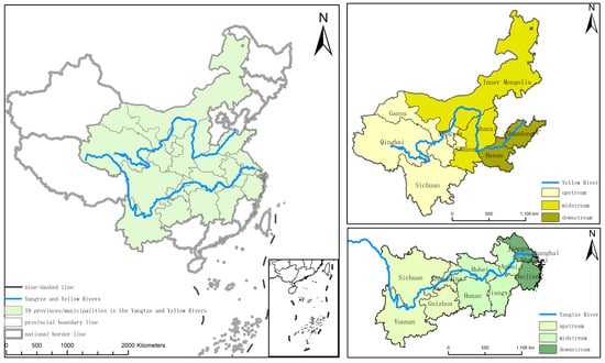 The study focuses on the Yangtze River and Yellow River Basins in China, encompassing the 19 provincial-level administrative regions within them. The specific delineation follows the guidelines outlined in the Outline of the Development Plan for the Yangtze River Economic Belt (2016) and the Outline of the Plan for the Ecological Protection and High-Quality Development of the Yellow River Basin (2021) for the respective division of the Yangtze River Economic Belt and the Yellow River Basin. Additionally, the division of the two major watersheds into upstream, midstream, and downstream regions is based on the work of Zheng (2023) [25] (Figure 1, Table 1).