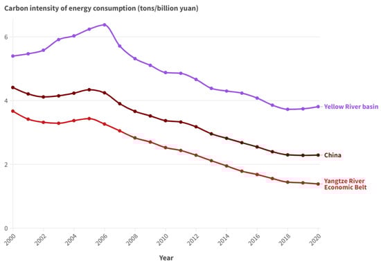 Trends in the evolution of carbon intensity in China, the Yangtze River Economic Belt and the Yellow River Basin, 2000–2020.