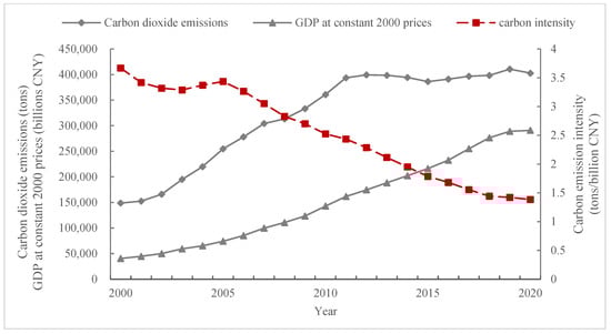 Evolutionary trends of carbon emissions, 2000 constant price GDP and carbon intensity in the Yangtze River Economic Zone, 2000–2020.