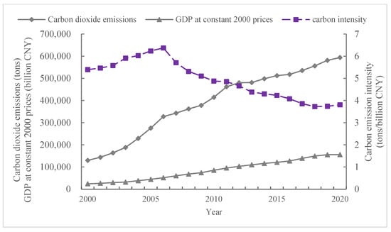 Carbon intensity, defined as greenhouse gas emissions per unit of GDP, serves as a key indicator to assess a region’s advancements in optimizing the benefits of energy utilization and reducing associated carbon emissions during its developmental process [2,3]. To date, many scholars have conducted an extensive array of studies addressing regional disparities and the factors influencing carbon intensity.