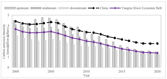 Evolutionary trend of carbon intensity in the Yangtze River Economic Belt by sub-basin, 2000–2020.