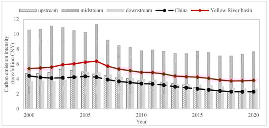 Evolutionary trend of carbon intensity in the Yellow River Basin sub-basin, 2000–2020.
