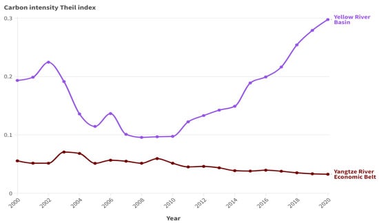 Trends in the change in the Theil index of carbon intensity in two major river basins, 2000–2020.