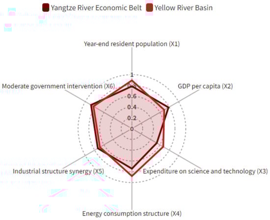 Radar chart of factors affecting carbon intensity in the Yangtze River Economic Zone and the Yellow River Basin, 2000–2020.