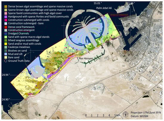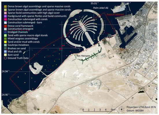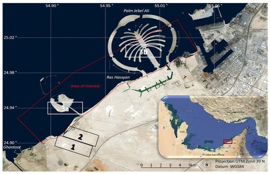 Mapping the benthic habitats of Dubai is a challenging endeavor when considering short-term management due to the dynamic changes in its marine and coastal environments. Although Dubai is renowned for its massive development projects that have reshaped its coastline, it has one declared marine protected area (MPA). The marine protected (no-take) area of 21.65 km2 (UNEP-WCMC (2022), known as the Jabal Ali Marine Sanctuary (JAMS) (Figure 1), is part of the wider terrestrial Jabal Ali Wildlife Sanctuary, which spans 76.69 km2. Despite the presence of the Palm Jabal Ali and Waterfront complexes, along with other large coastal construction projects adjacent to the sanctuary, the waters still harbor unique biological diversity []. The Jabal Ali Marine Sanctuary boasts one of the highest assemblages of scleractinian corals in the UAE, with 34 coral species identified in the 1990s [,]. Additionally, most of the coral species observed in the UAE and listed in its species red list are present in the sanctuary. Furthermore, the Jabal Ali Marine Sanctuary has observed the presence of endangered species, such as the mottled eagle ray and Indo-Pacific humpback dolphin, while Hawksbill turtles nest on its sandy beaches and its seagrass beds are fishing nurseries and feeding grounds for endangered green turtles and vulnerable dugongs. A part of the coral reefs, mangroves, and seagrass meadows of the Jabal Ali Wetland Sanctuary has been designated as a wetland of international importance (Ramsar site) that covers 2.002 ha [].
