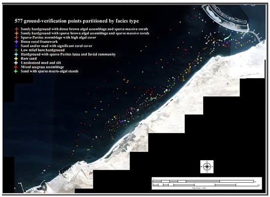 The data obtained from the 2006 survey (Figure 3, Table 1) were utilized to compile an ecological inventory of benthic habitats. Points were assigned color codes corresponding to their respective broad habitat categories. The survey was conducted from more than 570 spot observations of the seafloor across the study area. These observations aimed to gather accurate assessment data and establish an inventory of benthic diversity within the area. Spot checks were carried out using a combination of snorkeling and scuba diving. At each check spot, the seafloor was observed from an altitude of 1 m at the nadir, and a description of seabed morphology as well as its species composition was recorded. Digital GPS was used to precisely locate each spot for later reference. Photographic records were used to calibrate the estimated levels of substrate coverage, especially in areas with complex seafloor mosaics []. The spot check data were then categorized into eleven broad substrate categories and compiled into a database of ground verification data for accuracy assessment.
