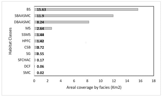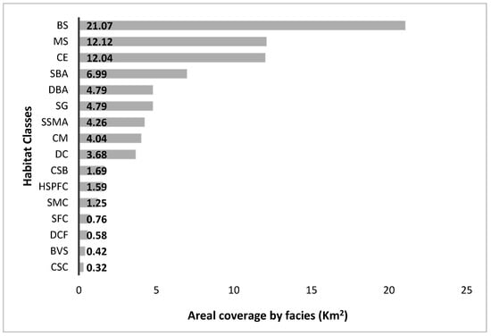 Characterized habitat classes with area coverage from the 2017 survey. Numbers on the plot indicate the area in km2. Abbreviations: BS—bare sand; MS—mud and silt; CE—construction emergent; SBA—sparse brown algal assemblage and sparse massive corals; DBA—dense brown algal assemblage and sparse massive corals; SG—mixed seagrass assemblages; SSMA—sand with sparse macro-algal stands; CM—Caulerpa meadows; DC—dredged channels; CSB—construction submerged—bare; HSPFC—hardground with sparse Porites and faviid community; SMC—sand and/or mud with corals; SFC—sparse faviid communities with high algal cover; DCF—dense coral framework; BvS—bivalves on sand; CSC—construction submerged with corals.