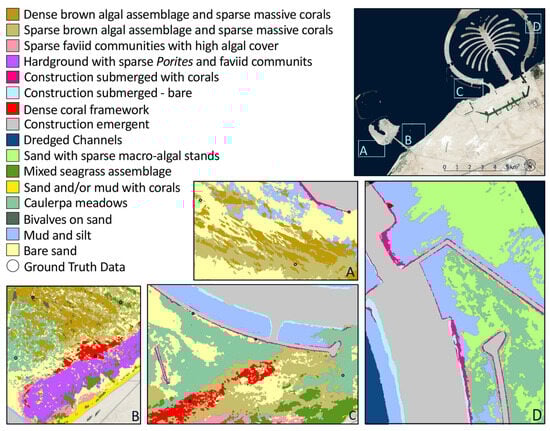 Remote sensing and habitat maps are widely used in coral reef conservation efforts [], the localization and selection of new MPAs [], and the design of climate-resilient MPA networks []. Once established, MPAs can use habitat maps as reference benchmarks for effective management and to assess the impact of human activities, such as offshore nutrient spills, brine discharges, and climate change-driven warming and acidification on benthic fauna [,,]. Although in the past 10 years, there have been very few anthropogenic activities in the JAMS, the results from the habitat map in this study highlight the habitats that require management interventions. The Waterfront and the Palm Jabal Ali have been halted, while the power plant is still in its construction stage and the desalination plant is still in its earliest land preparation stage. The impact of operationalization of these projects will have a potential effect on the coral reefs and other important habitats in the sanctuary.