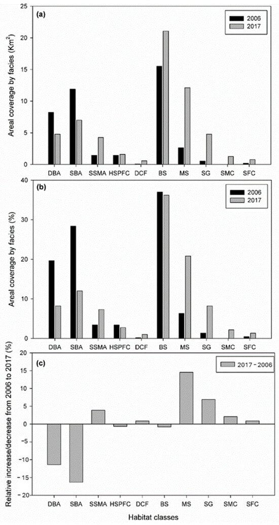 Comparison of areal coverage between marine habitats characterized in 2006 and 2017 with a total coverage of 41.96 km2 in 2006 and 58.20 Km2 in 2017. (a) Comparative representation of the area of each habitat in km2, (b) Relative contribution to the total area of the habitat map in between the 10-year gap. (c) Increase/decrease of the relative contribution to the total area of the 10 habitats that coincide in both samplings (2006–2017). Abbreviations: DBA—dense brown algal assemblage and sparse massive corals; SBA—sparse brown algal assemblage and sparse massive corals; SSMA—sand with sparse macro-algal stands; HSPFC—hardground with sparse Porites and faviid community; DCF—dense coral framework; BS—bare sand; MS—mud and silt; SG—mixed seagrass assemblage; SMC—sand or mud with corals; SFC—sparse faviid communities with high algal cover.