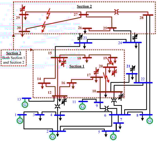 - Section 2 has two critical line outages, which are 27–29 and 27–30, so the last six buses are selected for this section, as shown in Figure 1. This section includes six buses, which are 25, 26, 27, 28, 29, and 30.