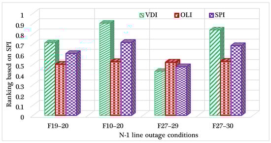 The systematic assessment of N-1 line outages was addressed on the IEEE 30-bus power system. For all N-1 line outage conditions, the loading of all branches remained within acceptable limits for most conditions except in four critical N-1 line outage scenarios: F19–20, F10–20, F27–29, and F27–30, as shown in Table 1. These lines were identified as causing overloading on at least one line and ranked based on an SPI, Equation (1). Figure 3 illustrates the ranking of the four most critical N-1 line outage contingences based on the SPI.