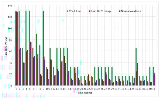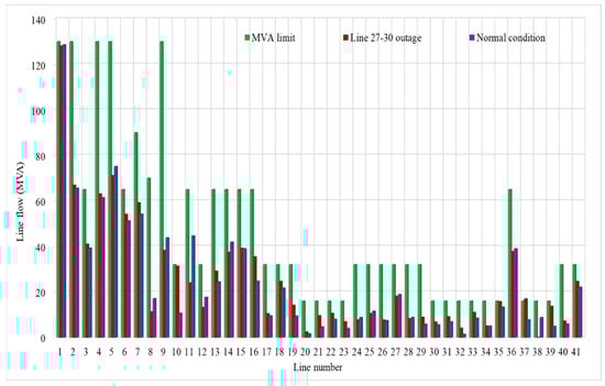 The line flow under pre-contingency and post-contingency (line 27–30 outage: line no. 37) compared to maximum limit.