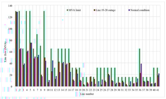 - For all N-1 line outage conditions, the loading of all branches was within limits except the four N-1 line outage conditions. The four line outage conditions that have at least one overloaded line are F19–20, F10–20, F27–29, and F27–30, as shown previously in Figure 1.