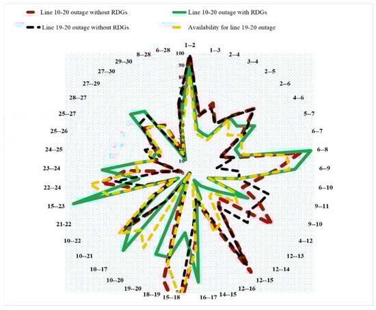 The line loading % for the IEEE 30-bus benchmark system network with and without RDGs under line 10–20 outage.