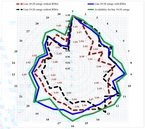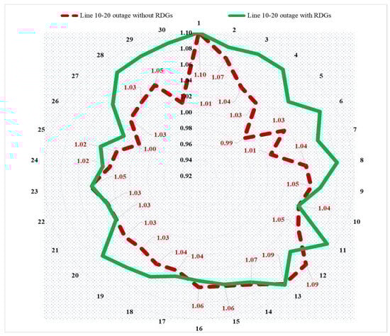The voltage profile for the IEEE 30-bus benchmark system network under line 10–20 outage with and without five RDGs at the optimal buses 14, 15, 17, 20, and 30.